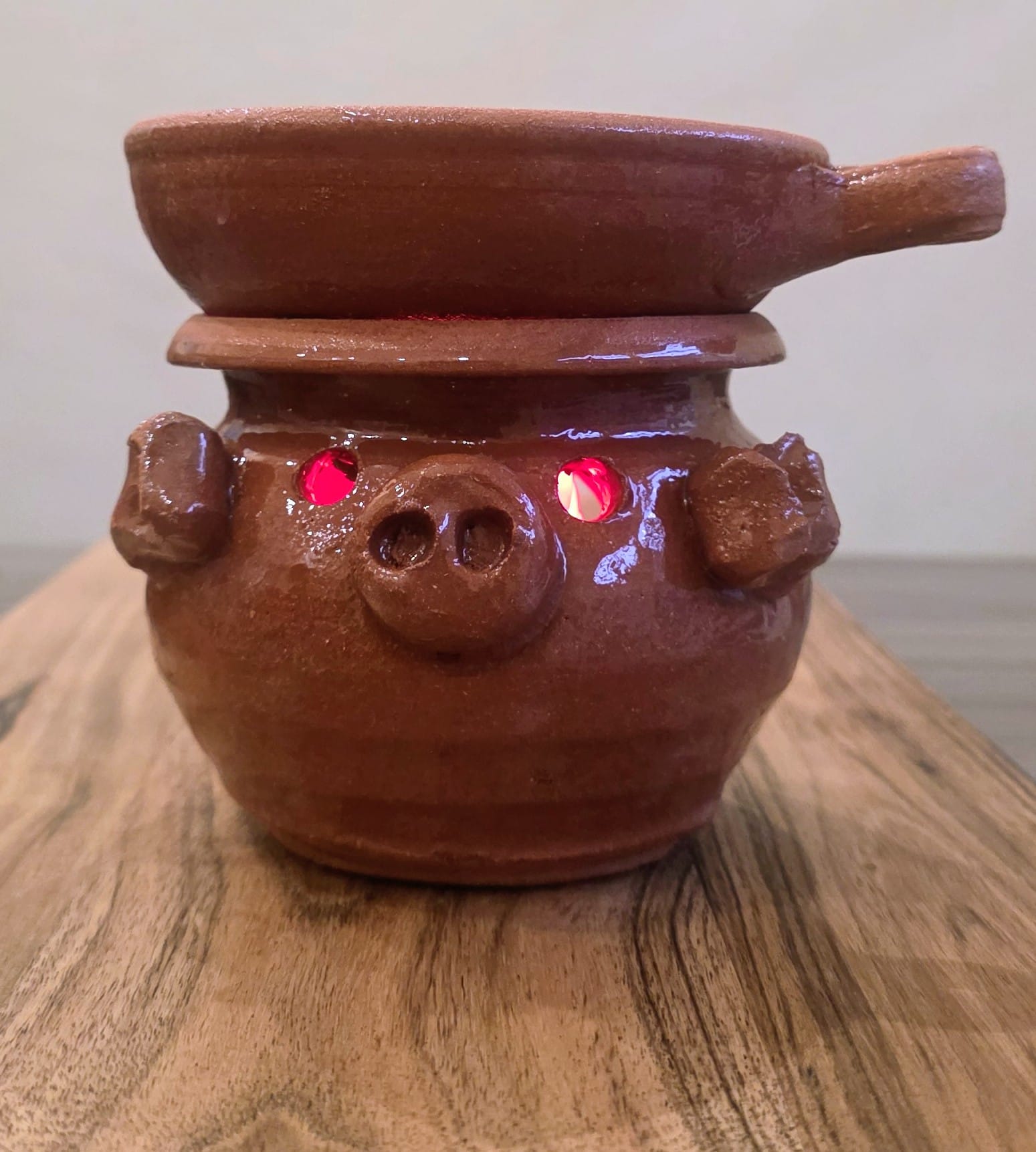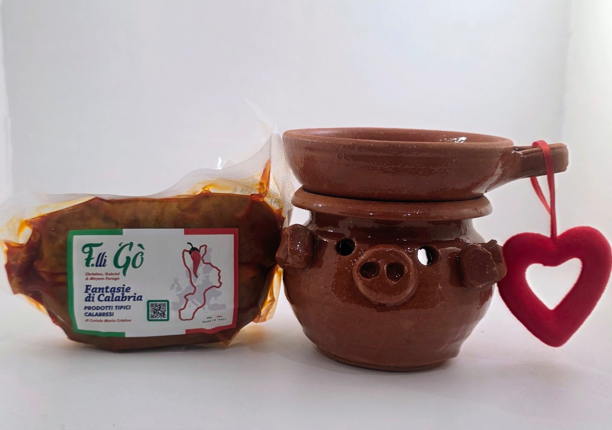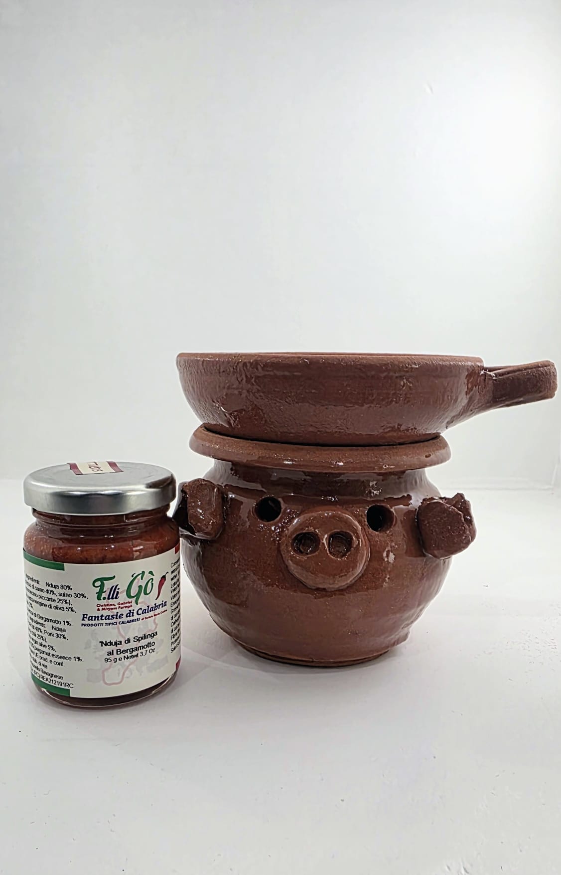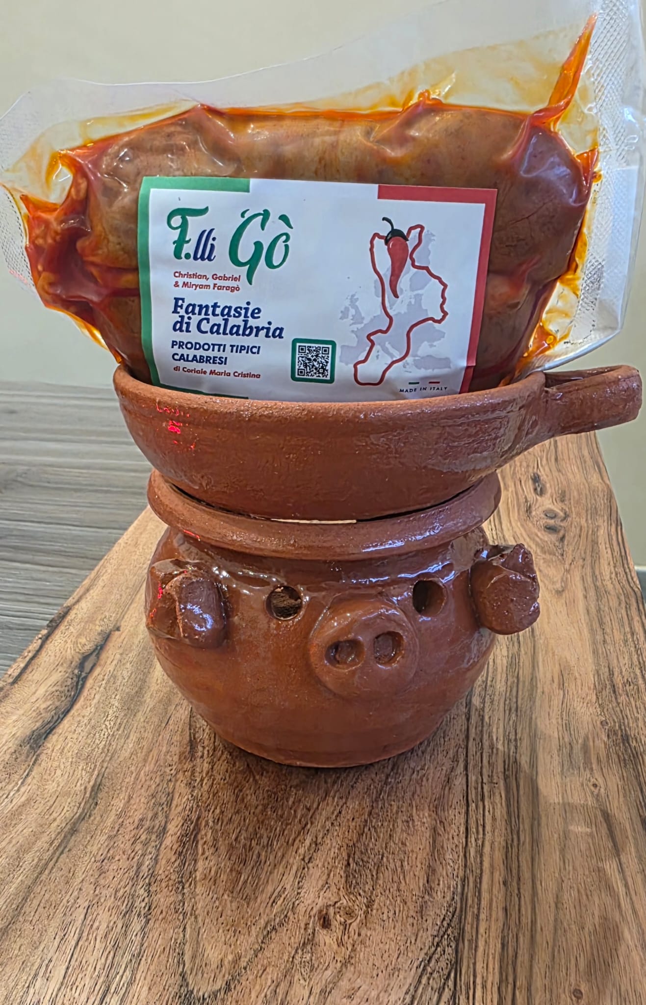 Il tegamino di terracotta a forma di maialino valorizza la ’nduja con una cottura lenta e uniforme. Il calore dolce del coccio permette alla ’nduja di sciogliersi gradualmente, raggiungendo una consistenza cremosa e omogenea, senza surriscaldarsi.