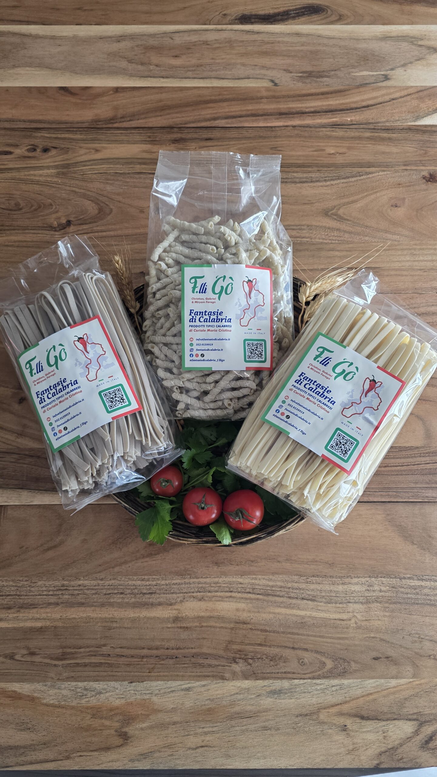 Le tagliatelle calabresi aromatizzate al bergamotto sono un connubio unico tra la tradizione della pasta fatta a mano e l’eleganza agrumata del frutto simbolo della costa jonica. La loro sfoglia ruvida e porosa trattiene il profumo intenso e fresco del bergamotto, che sprigiona note aromatiche delicate ma riconoscibili, capaci di esaltare condimenti sia semplici che più strutturati. Ogni boccone racconta i sentori del Mediterraneo, con un equilibrio armonioso tra la dolcezza della pasta e la leggera acidità agrumata, per un’esperienza gustativa autentica, sorprendente e profondamente legata ai sapori della Calabria.