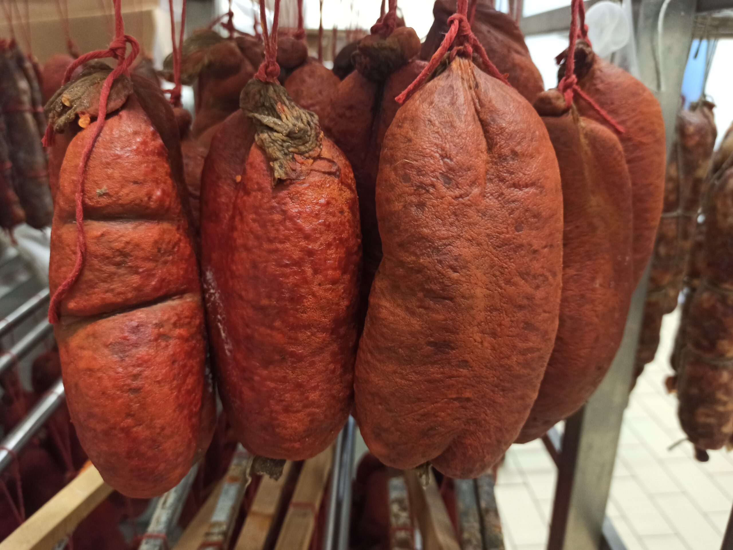 • Produzione: dopo aver macinato la carne e mescolata con il peperoncino, l’impasto viene insaccato nel budello naturale e affumicato leggermente, poi lasciato stagionare per alcune settimane.