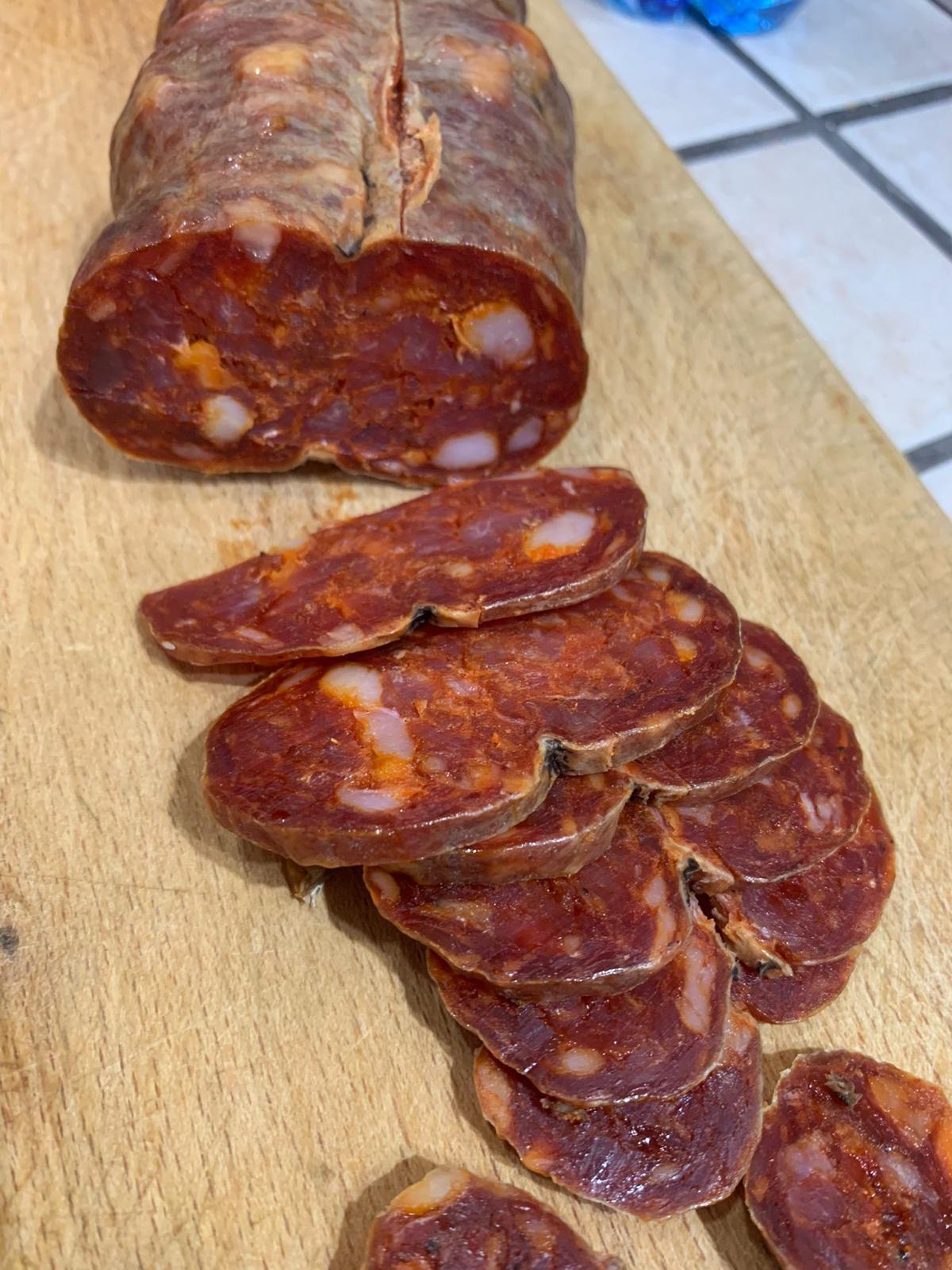 - Budello e legatura: viene insaccata in budello naturale, pressata leggermente (da qui il nome soppressata, cioè “schiacciata”) e legata con spago.